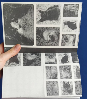 It’s a book showing my collection of stickers. I’ve been collecting stickers since 2015 and first made this book in 2019 as a single copy by duplicating my entire sticker collection using my old black and white laserjet. Reproducing the collection in black and white really emphasizes the grid patterns. Love it.