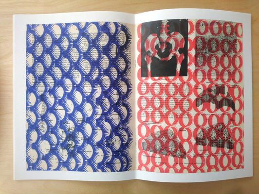 Dans Biologia grafica – livre d’artiste unique – Gianpaolo Pagni recouvre son ancien livre d’école avec des dessins aux tampons. Les empreintes colorées laissent apercevoir l’écrit initial comme une toile en arrière du plan et participe
