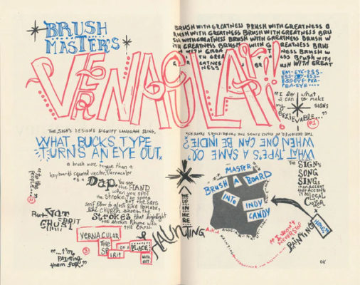 First, Kyle Long interviews the man himself. Jasper « Mississippi » Travis, who paints signs under the name Brush Master, describes his start and evolution as a sign painter, as well as the philosophy behind his approach. In the center-spread, artist and poet Douglas Kearney uses his own lettering and design scheme to reflect on the cultural significance of the Brush Master. In a short but unusually rich essay titled « Drum machines have no soul: the enduring appeal of hand-painted signs » writer Sam Roberts contextualizes the Brush Master’s work within the history of sign painting and supplies a smart guide to recommended reading and viewing for those who want more. Finally, Tatjana Rebelle, a writer and activist who grew up seeing signs by the Brush Master around Indianapolis, crafts verses inspired by his work.