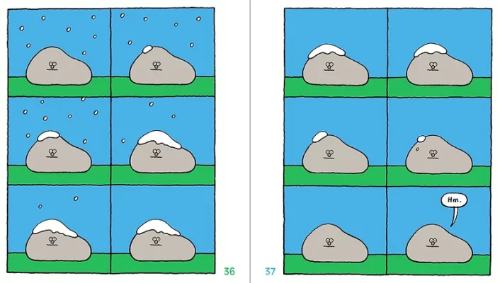 Ce livre propose une méditation comique, où un caillou sympathique et doué de conscience, nous fait part de sa sagesse ancestrale… Le dessin, minimaliste et répétitif, s’efface presque devant ses pensées millénaires. Le temps s’écoule et les bons mots sont distillés au fil des pages, à un rythme savamment dosé. On regarde le temps passer. Et chaque apparition des éléments extérieurs, vent, pluie, escargot, un randonneur, est un véritable évènement venant perturber cette apparente quiétude, ainsi que les certitudes de ce docte caillou. Cette nonchalance et cette stylisation d’une grande simplicité, sont au service d’un ton et d’un rythme personnel.