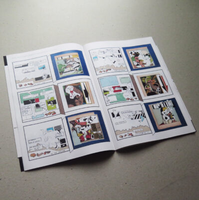 Avec dans un coin de la tête les bandes dessinées populaires de son enfance, autant qu’un goût affirmé pour la bizarrerie et les pas-de-côté en matière d’art, toutes catégories confondues, Gabriel Hibert s’arme, fin 2022, d’une feuille de bristol A4 300 gr. Il y dessine un gaufrier conventionnel de six cases presque carrées, le photocopie en série, avant de se lancer dans l’aventure. Soupçonne-t-il alors qu’il s’apprête rejoindre une ébullition mentale, sensible, plastique et formelle qui occupe nombre d’auteurs et d’artistes depuis des décennies ? Les amorces sont souvent pulsionnelles : découper un bout de case dans un magazine, le coller, laisser dériver le trait alentour, y ajouter du crayon de couleur, des bribes de textes (humeurs, pensées fugaces, jeux de langue, inepties assumées, rebonds, répétitions…), se laisser prendre au plaisir du dessin de la lettre, toujours soumis à cette impulsion du tracer qui, peu à peu, contamine tout. Un virus. Au fil du temps, les planches s’architecturent, travaillent les échos graphiques, les rebonds, les ellipses, laissent surgir des titres, s’accumulent et commencent à “faire collection”. Pour finir par se décliner en diptyques, parce que dans un livre, les pages se font face et qu’il y a les potentialités d’une gémellité à exploiter.