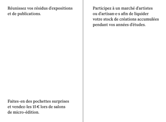 Cet ouvrage partage un ensemble combines, trucs et astuces qui ont permis à des travailleurs et travailleuses du milieu de l’art de s’en sortir après l’école. Ces courtes consignes rédigées à l’impératif présent nous livrent, non sans ironie, quelques éléments de réponse à cette grande question : comment survivre après l’école d’art?