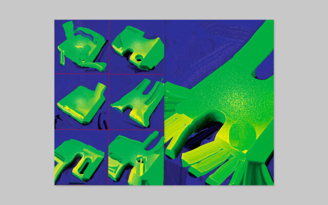 Thomas Perrodin manipule à l’ordinateur des dessins faits à la main, lui permettant de jouer avec la répétition et la distorsion d’éléments graphiques jusqu’à saturation de la page.