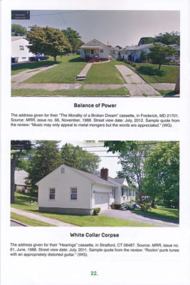 In addition to a five page essay by Fischer on the project, its findings so far, and its methodology, this booklet includes photos of 66 different band-related houses. Among the bands included are: The Crucifucks, The Didjits, The Offenders, Cryptic Slaughter, Koro, Capitalist Casualties, Poison Idea, Breakdown, Pussy Galore, Sonic Youth, Dead Virgins, Urge Overkill, Rights of the Accused, Organ Donors, Phantom Tollbooth, Uniform Choice, End Result, Murphy’s Law, Impulse Manslaughter, No Use for a Name, Suburban Mutilation, N.O.T.A., and many more.