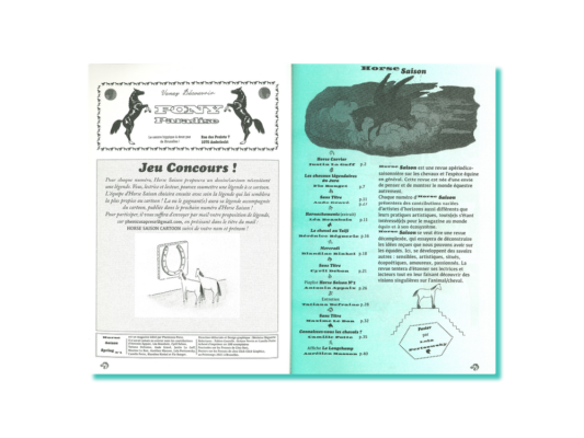 Horse Saison est une revue apériodico-saisonnière sur les chevaux et l’espèce équine en général. Cette revue est née d’une envie de penser et de montrer le monde équestre autrement. Chaque numéro présentera des contributions variées d’artistes d’horizons aussi différents que leurs pratiques artistiques, touts(e)s s’étant intéressé(e)s pour le magazine au monde équin et à son écosystème.