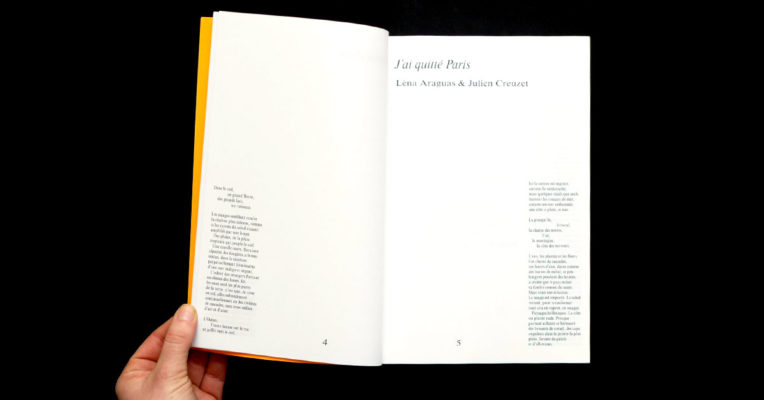 J’ai quitté Paris juxtapose des écritures de natures différentes, les unes imageant les autres, parfois lune, regard, tête en l’air, parfois paysage défilant, envolée filante. L’ouvrage s’articule autour de trois textes. Des extraits des Indes Galantes de Jean-Philippe Rameau (1735) ouvrent chaque cahier de texte. Des poèmes de Julien Creuzet composent le corps de texte principal. Ce dernier est accompagné de notes, montages de descriptions paysagères extraites de la collection Toutes nos colonies (1931). Ces extraits ont tous été placés à leur pagination initiale, forçant la rencontre des géographies décrites dans ces ouvrages. Ces ensembles de texte sont séparés par des cahiers d’images, où les photographies de Julien Creuzet se superposent à des détails de l’iconographie de Toutes nos colonies.