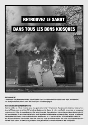 Sortis de nos confinements, lors d’une dérive sauvage, nous irons déboulonner toutes les chaises clouées au sol pour en faire des tours, hautes et majestueuses. Nous nous assiérons en divers endroits afin de rire ensemble devant une rue devenue commune et viscères. Ces bar- ricades seront les plus beaux bancs sur lesquelles nous étendre. Les mots y seront toujours projectiles.