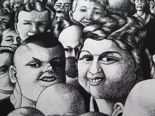 L’Enfant naturel est un livre qui s’articule au fil de 64 images sublimes, entre pointillisme réaliste névrotique et expressionnisme discrètement libidinal, publiées en pleine page. Un récit initiatique à la première personne d’années de jeunesse troubles, hantées par la pauvreté, la solitude, les discriminations et les coercitions multiples. Ancrée dans cet espace-temps suintant des Trente Glorieuses finissantes, l’histoire emprunte à la préciosité d’une syntaxe d’un autre siècle comme pour mieux appuyer quelque chose d’une nostalgie un rien morbide, néanmoins envisagée comme socle d’une détermination individuelle trempée. Le caractère édifiant de ce parcours est alors figuré par le chemin vers l’école, partant de la campagne profonde, entre corps de fermes vétustes et granges croulantes, en direction de la grande ville. À travers champs et forêts, d’abord, sous le regard indifférent des calvaires et des bêtes sauvages. Avant de pénétrer pas à pas dans l’espace urbain, errance programmatique vers une « civilisation » qui n’a su que trop bien hiérarchiser la position des êtres selon leur habitat : bidonville, barres d’immeubles, puis pavillons bourgeois…. L’école, alors, apparaît comme le cœur des enfers, saturé de corps tordus et de faces difformes, tout à la brutalité d’une enfance qui n’a gardé du parfum du jardin d’éden que l’irréductible foi en l’avenir du narrateur.