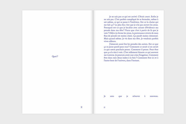 « J’écoute cette voix à l’intérieur de moi. Tant qu’elle parle, je ne dors pas — dans le sommeil, on ne fait qu’une je crois, et alors je ne l’entends plus. Si je peux la juger, ainsi éveillée, c’est qu’à l’intérieur, on est deux. Et parfois je me demande si on n’est pas plus nombreux. J’habite une vieille maison. À l’intérieur, on n’y voit rien mais c’est aussi vaste que dehors. C’est beaucoup plus grand que mon corps ne le laisse entendre de l’extérieur. Dedans, dehors, c’est le même espace si j’ouvre la porte. Si j’ouvre la porte, la lumière entre, mais elle peut ne pas venir seule. Ma sœur m’a parlé l’autre jour de son monde intérieur. Quand elle a dit ça, je me suis approchée, j’ai regardé son iris de très près, et j’ai vu ce trou noir dans son œil. J’ai eu peur comme au-dessus d’un puits sans fond. Je ne voudrais pas tomber dans le puits d’un autre. »