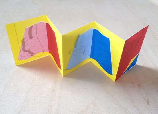 Une moitié BLAH-BLAH-BLAH, des phrases qui se tortillent, machine de guerre à faire danser l’absurde et le sublime. L’autre moitié SPLASH, une cuillère rose, un timbre vert, une fourchette bleue, un bateau blanc.