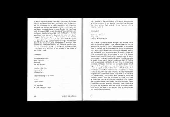 Problèmes de localisation contient sept textes, composés d’analyses critiques, de récits personnels et de poèmes, qui racontent cette entrée dans un environnement où circulent les corps, les marchandises, les informations et les capitaux. Élise Legal s’y déplace en voiture, en co-voiturage, en train, en bus ou en avion, découvrant ce que ce monde de transaction et de fluidité fait au langage. Elle cherche à comprendre comment il est incarné, échangé et habité dans les voix des pilotes d’avion, des startupers ou du président de la République, dans les textes de loi, les formulaires de demandes de bourses, la parole de ses enseigant·es, dans les textes de théorie critique comme dans la poésie des banquiers.