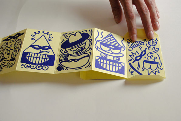 Le texte d’un coté, les images de l’autre, les pages se déplient, se détachent et se rangent dans la couverture-boîte une fois le combat final achevé.