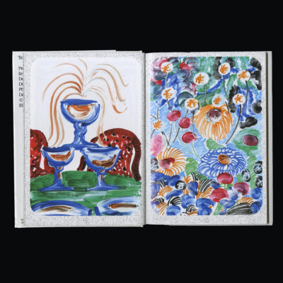 La série ne prend sa forme définitive que dans ces multiples, mis en page dans un objet au format proche des dessins originaux. Le papier glacé restitue la brillance et la froideur de l’ardoise, tandis que la jaquette extérieure enveloppe une couverture cartonnée qui, elle, préserve la douceur réconfortante des papiers bouffants. Cette dernière accueille une joyeuse coupe de fruits, ayant perdu ses couleurs.