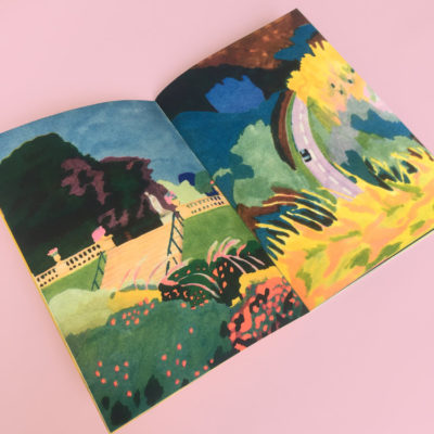 Les images sont reproduites en quatre encres riso, ce qui confère au livre une charge picturale importante. Le mélange des trames permettant de retrouver la douceur des formes, et la vibration des teintes. Des encarts blancs viennent briser la chromie et créent des zones de vide, des double pages à bords perdus sont saturées d’encre et l’ensemble de ce livre muet se regarde accompagné d’une carte postale qui donne quelques indices sur l’origine de ces lieux.